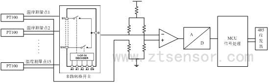 使用體積小、重量輕的鉑電阻(Pt100)作為溫度敏感元件,利用大規(guī)模集成多路轉(zhuǎn)換開(kāi)關(guān)分時(shí)選通每路溫度信號(hào),然后通過(guò)高速模數(shù)轉(zhuǎn)換器將模擬溫度信號(hào)轉(zhuǎn)換為數(shù)字信號(hào)。通過(guò)單片微處理器MCU將信號(hào)進(jìn)行數(shù)字濾波,線性校正,偏移補(bǔ)償,最終通過(guò)RS485總線將溫度數(shù)據(jù)以指定的幀格式傳送出去。