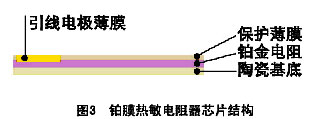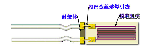 鉑膜熱電阻的溫度測(cè)量原理是:熱能 鉑膜電阻值變化。電阻器封裝采用耐溫材料,芯片與封裝體之間的電氣連接采用金絲球焊件,如圖4所示。
