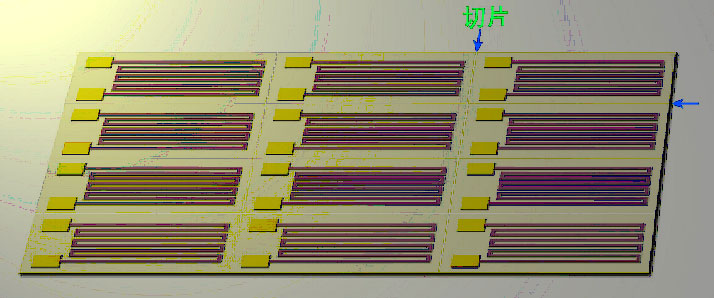 一般選用陶瓷作為基底材料,對(duì)于要求快速響應(yīng)的熱電阻采用導(dǎo)熱性好的金屬材料作基底,經(jīng)拋光后,在基底材料上沉積一層絕緣膜,然后在絕緣層上濺射鉑電阻膜,經(jīng)離子束刻蝕成柵條電阻,再在電阻膜層上濺射一層保護(hù)絕緣膜。每片基片上可制造10-20支電阻器圖5,芯片制造工藝完成后再進(jìn)行切片,內(nèi)引線,封裝,檢測(cè)。選用PT100作為溫度敏感元件,精度為1/3B級(jí),溫度誤差為0.3度。該電阻在0攝氏度時(shí)電阻為100Ω。由于產(chǎn)品工作在-150℃~150℃,且引線長(zhǎng)度為0.5m,因此引線選用溫度適用范圍寬的特氟龍F(tuán)4,它可以制成外徑很細(xì)的線纜,質(zhì)量輕。每只溫度PT100鉑膜熱電阻和導(dǎo)線總重控制在1g~1.2g。